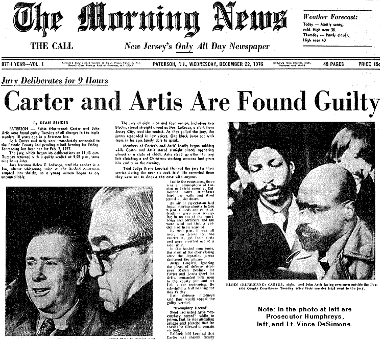 A acusação conseguiu desqualificar o álibi apresentado pelos acusados e o pior é que eles não tinham nenhum evidência que comprovasse que Carter e Artis fossem de fato os autores do delito. Poucos anos depois em 1974, uma das testemunhas masculina Bello se retratou dizendo que havia mentido e Bradley um dos que havia ter dito reconhecer o boxeador como autor dos disparos que haviam vitimado três pessoas e deixado uma com sérios problemas pelo ferimentos causados pela arma de fogo também fez o mea culpa e tal atitude foi base e a sustentação para a reabertura do caso e o julgamento fosse refeito, mas o juiz Samuel Lerner não aceitou dizendo que naquele caso "não havia o anel da verdade".